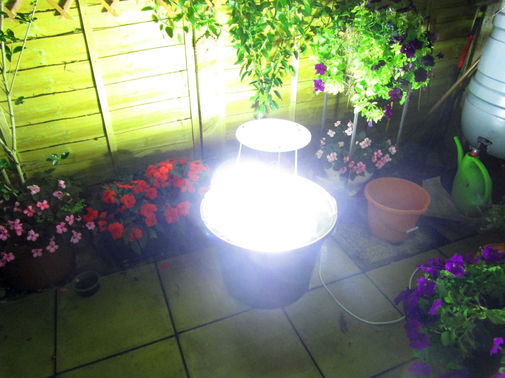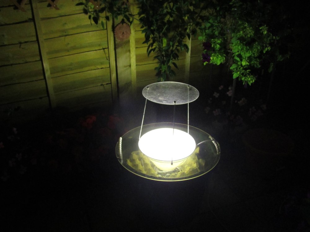 The first picture was greatly under-exposed so you could see through the perspex lid but in practice it looks more like this. I usually run the trap between the conservatory door and the neighbour’s fence a) because its sheltered from any wind and b) to avoid shining the light directly into neighbour’s bedroom windows.