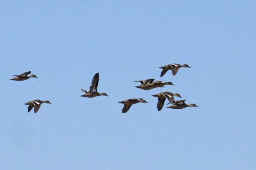 …. although any attempt to get closer just resulted in flushing them. In this photo a few Black-tailed Godwits, tattlers and others can be seen in flight but the majority are Great Knots with a few Red-necked Stints in the foreground.