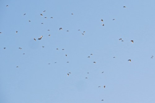 Suddenly we came across a group of 58 pigeons feeding in front of us. They were directly into the sun and very flighty. Scope views yielded what I had hardly dared hope for, Flock Bronzewings, a nomadic and elusive pigeon of the northern interior, here at the very edge of its range. My photos show little more than bumps on the ground so …