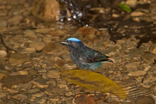 Blue-crowned Manakin, bathing in the stream at Carara NP. Copyright Pete Morris/Birdquest