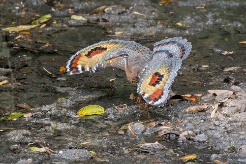 A Sunbittern making an aggressive display to two Black Phoebes intruding on its territory. Copyright Pete Morris/Birdquest