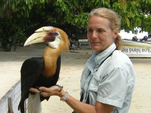 I first met Patty in 2012 when we both participated in a Birdquest trip to some of the remoter parts of Papua New Guinea. Sharing a number of interests, including ringing/banding birds we have made kept in touch since and Patty has visited me at least twice in the UK and we have also met up in New York and on the 2016 Birdquest reunion in Mallorca. Here Patty is holding a tame Blyth’s Hornbill in a PNG village.