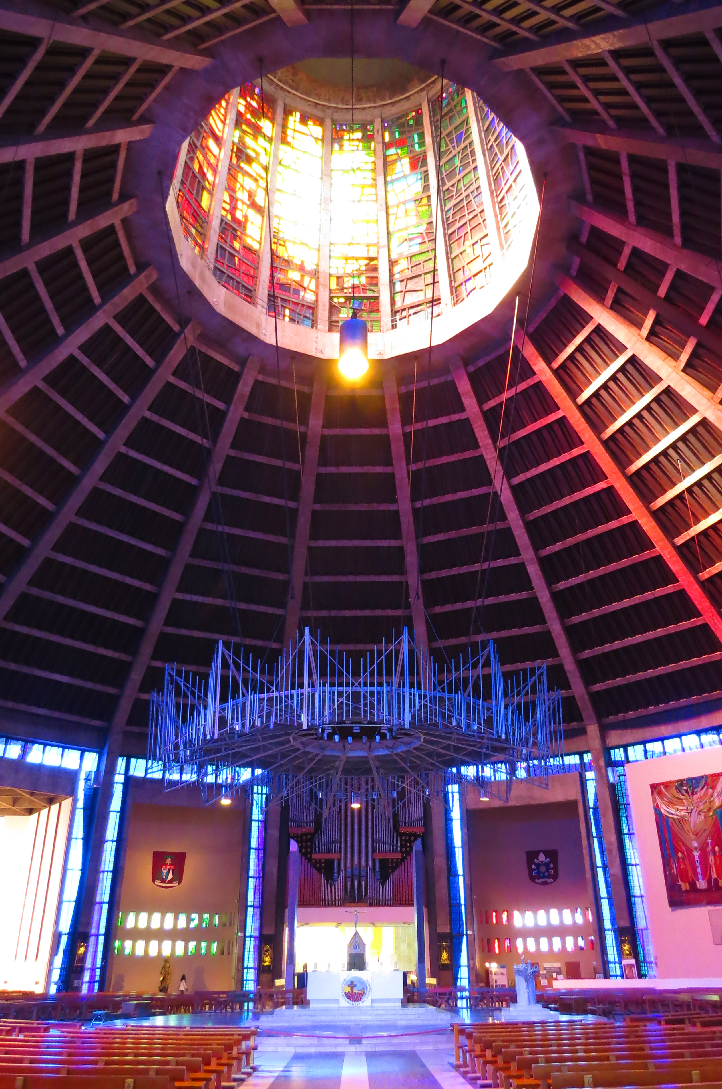 The circular design and the beautiful colours are quite breathtaking. Again from Wikipedia: ‘officially known as the Metropolitan Cathedral of Christ the King,[it] is the seat of the Archbishop of Liverpool and the mother church of the Roman Catholic Archdiocese of Liverpool in Liverpool, England. The Grade II Metropolitan Cathedral is one of Liverpool’s many listed buildings. To distinguish it from the Anglican Liverpool Cathedral, locals call it the “Catholic Cathedral.” Nicknames for the building include “Paddy’s Wigwam” and “The Mersey Funnel.” Unlike the Anglian one, construction was rapid, starting in 1962 and completed by 1967 although the site was purchased as long ago as 1930.