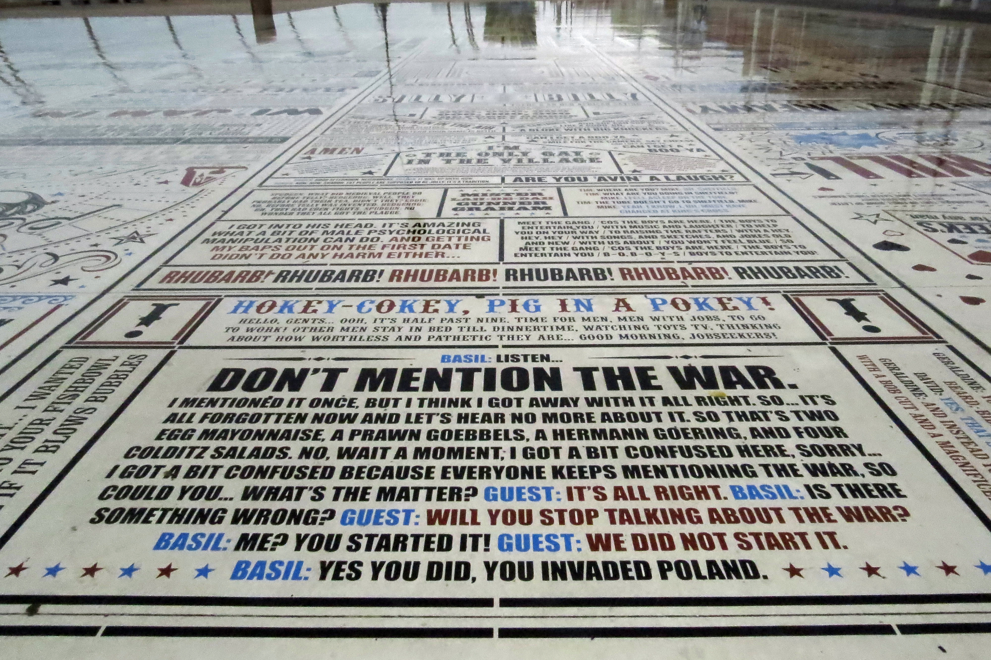 …. but I was amused by these tiles on the promenade composed of a collection of comedy punch lines and dialogues, none more so then this famous dialogue from Fawlty Towers. The sketch, of course, was not intended to be critical of the Germans but of those fuddy-duddy Brits (epitomised by Basil Fawlty) who couldn’t put the past behind them. As can be clearly seen in this photo the rain was now very heavy, so we returned to the hotel to dry out.