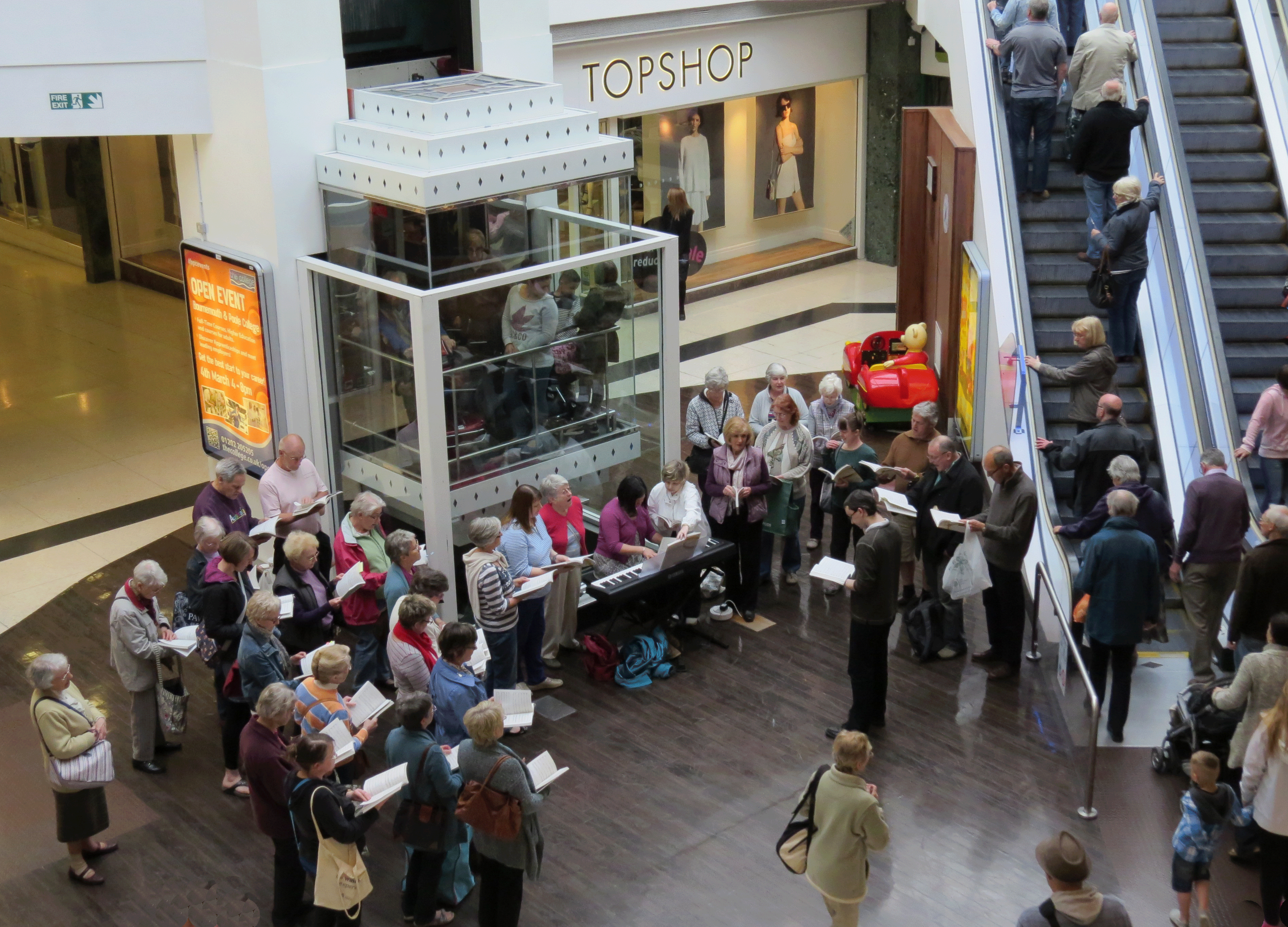 I had to leave the demo at Arne in the capable hands of Shaun, Carol and others and hurry back to Poole in Bank Holiday traffic conditions to see Margaret’s choir perform a ‘flash-mob’ in the Dolphin shopping arcade. The choir suddenly appeared out of nowhere and gave a good rendition of Handel’s ‘Hallelujah Chorus’ from the Messiah. They drew a large appreciative crowd but unfortunately it was over far too quickly and most drifted away wishing there had been more.