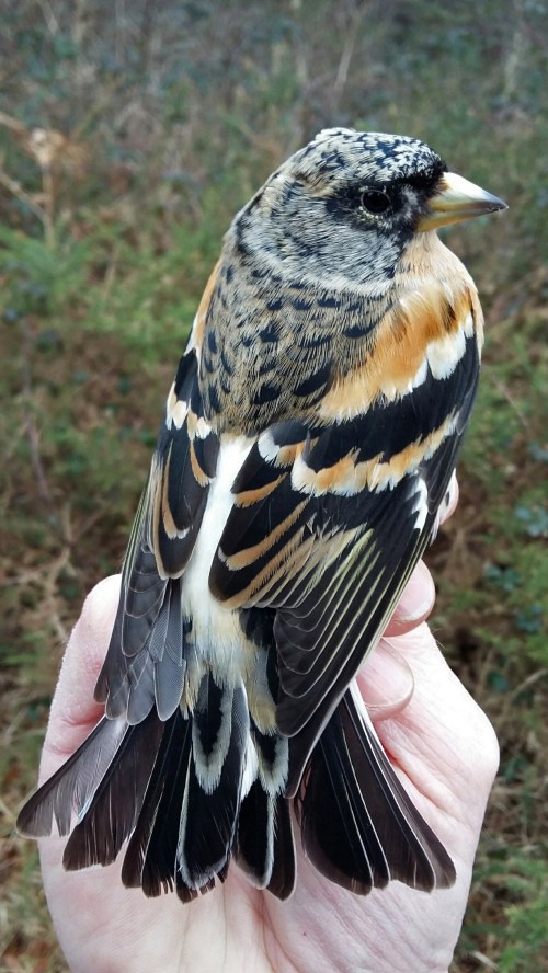 I spent a morning ringing at Holton Lee on 17th and Feet’s Lane on 21st. The former was predictably busy with common species like tits, Nuthatch etc trapped. After four winters of ringing there we are building up an interesting picture of the site fidelity and longevity of the birds, with retraps of several individuals that were hatched in 2011 or earlier. This female Bullfinch was ringed at Fleet’s Lane. The grey, brown edged alula and primary coverts indicate it is a first year bird, however the best ageing characteristic is brown edging to the carpal covert, a small feather that can only be seen on the closed wing.