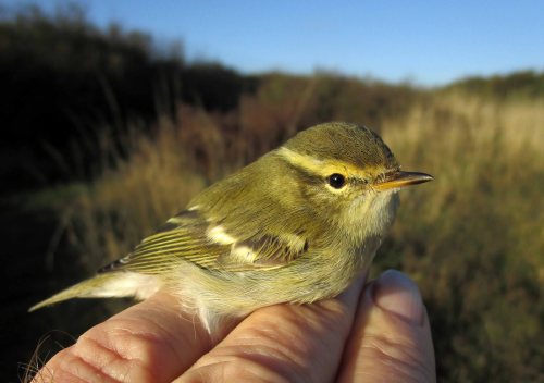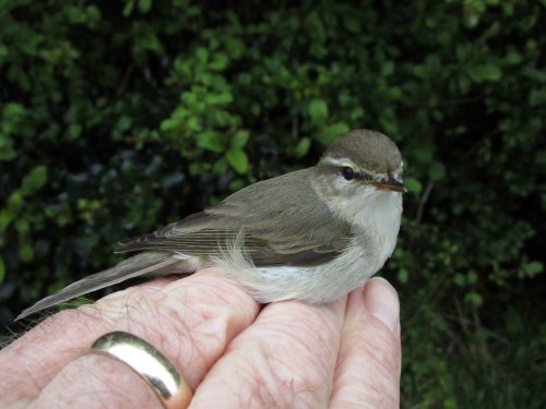 Today was the first date since the start of August where we haven’t trapped either a Willow Warbler or a Chiffchaff at Durlston. However in world terms YBW is perhaps the most numerous of the genus Phylloscopus, breeding across vast swathes of the Siberian taiga. This species needs to be distinguished from the very similar, but considerably rarer, Hume’s Leaf Warbler (with which it was once considered conspecific) but Hume’s is greyer, has a reduced median covert bar, all dark bill, darker legs and paler centres to the tertials and coverts. They also differ considerably in vocalisations, but that would have been of no use in this circumstance. Photo by Simon Breeze.