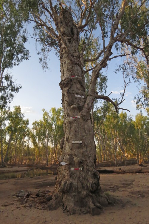 The water levels were low but marks on a tree by the river bed reminded up of just how high the flood water can reach.