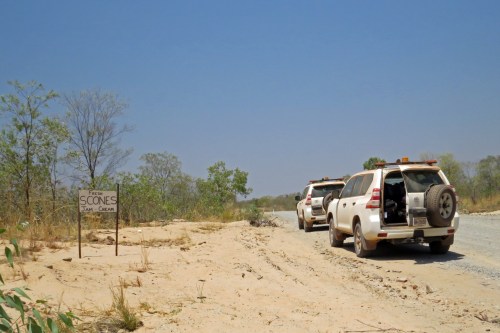 We wouldn’t see a paved road again (apart from a few short stretches over bridges) until we were almost at Kununurra in three days time. It was a given, especially for those in the second vehicle, to be enveloped in dust at all times. Note the radio aerial on the left of the bonnet has snapped of from all the vibration.