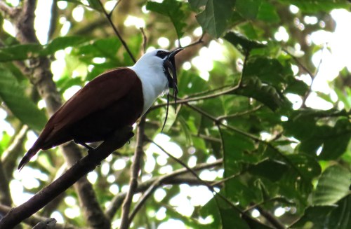 Our main target was the amazing Bare-necked Umbrellabird which used to lek in a tree some 45 minute walk from the lodge. Unfortunately this lek site has been abandoned since 2014 (although the tour information still says that you have a very good chance of seeing one here). We did see some great birds in the area though. In the pastures around the lodge was a colony of Montezuma’s Oropendolas (above) ….
