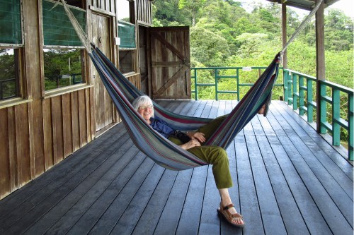 …. and a balcony with great views of Volcan Arenal. Alison is demonstrating how to get into a hammock without ending up on the floor, something I have yet to master.
