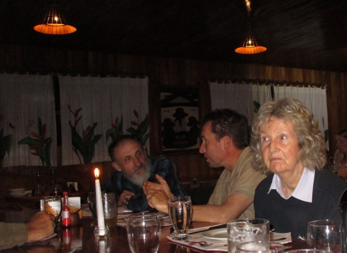 Although we had started to see a number of species of owl, we still were short of Bare-shanked Screech Owl that we had dipped on so spectacularly at Cerro de la Muerta. Pete suggested we go back to the start of the San Gerado track after dark where to everyone’s delight we scored with Mr Bare-shank (but I didn’t get any photos). Later at a restaurant near the hotel we met up with Robert Dean (left), an acquaintance of Pete’s and a Monteverde resident. Robert is the illustrator of the Helm Field Guide to the Birds of Costa Rica. Originally from the UK he once had an interesting career as a rock guitarist and was a member the 80’s band Japan.