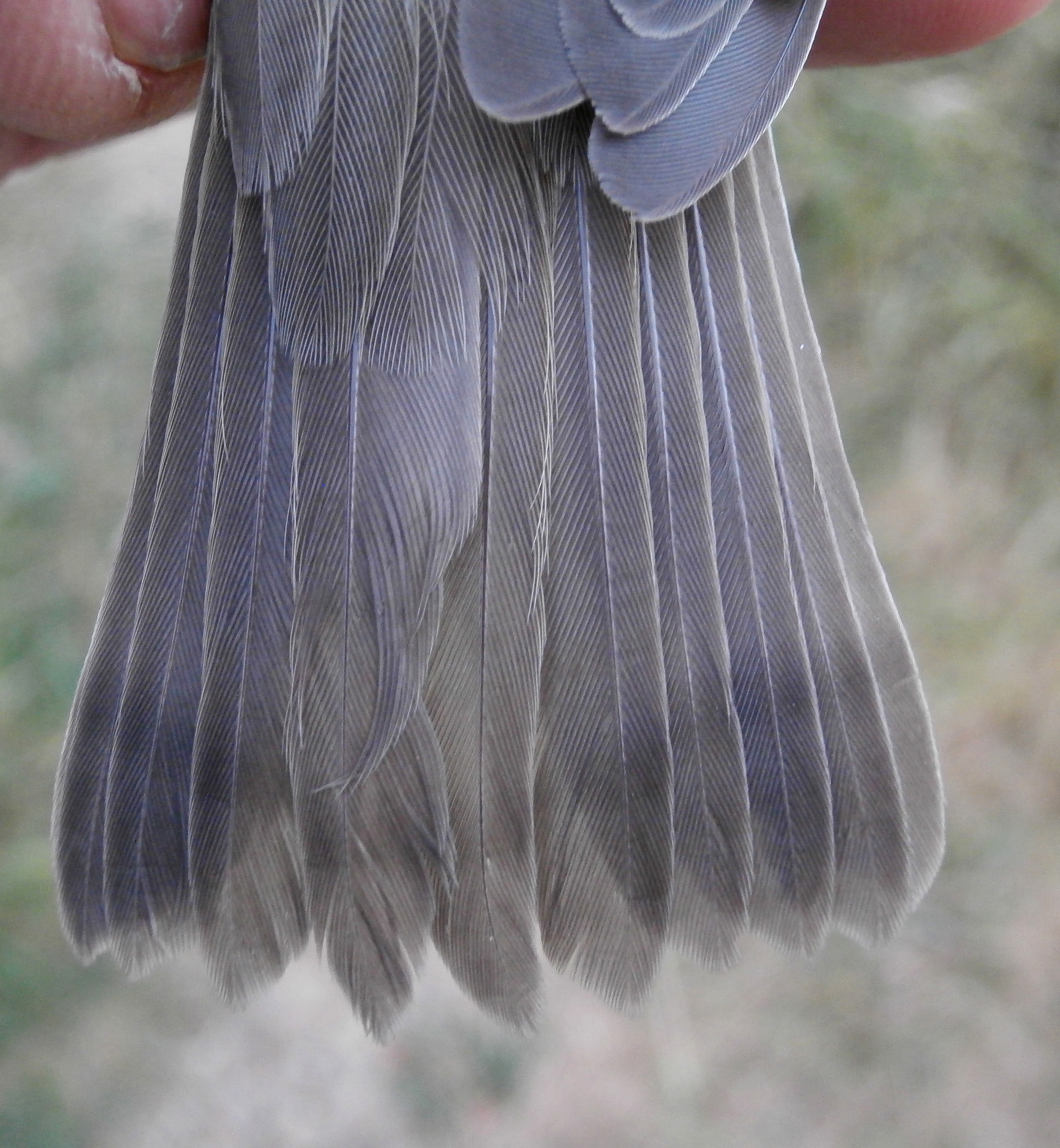 Even so, the shape of the tail can be misleading when it comes to ageing birds and caution is advised. Trainee ringers are taught that pointed and abraded tail feathers are indicative of first years (abraded, because in most species adults moult in the summer after the young have fledged so their tail feathers are newer and less abraded than young birds that grew the feathers in the nest). However if a young bird was to lose all its tail feathers (through moult or accident) then the feathers would be regrown in the adult shape. This can be seen in this Reed Bunting tail where the outer two feathers on the right have been lost and are regrowing and are clearly newer and more rounded then the retained first year feathers.