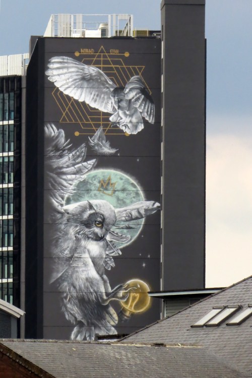 Later we all returned to Leeds for a spot of lunch. When I lived there in the 70s Leeds was a drab northern town (although still full of character). Today it is lively, modern and beautifully decorated (for example by these owls on the side of high-rise building).
