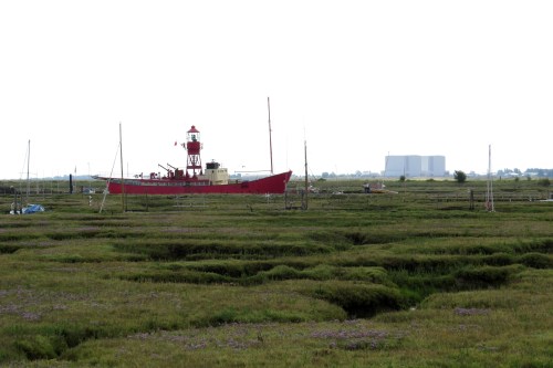 An old lightship and Bradwell power station (on the south shore of the Blackwater) are seen above the expanse of salt marsh.