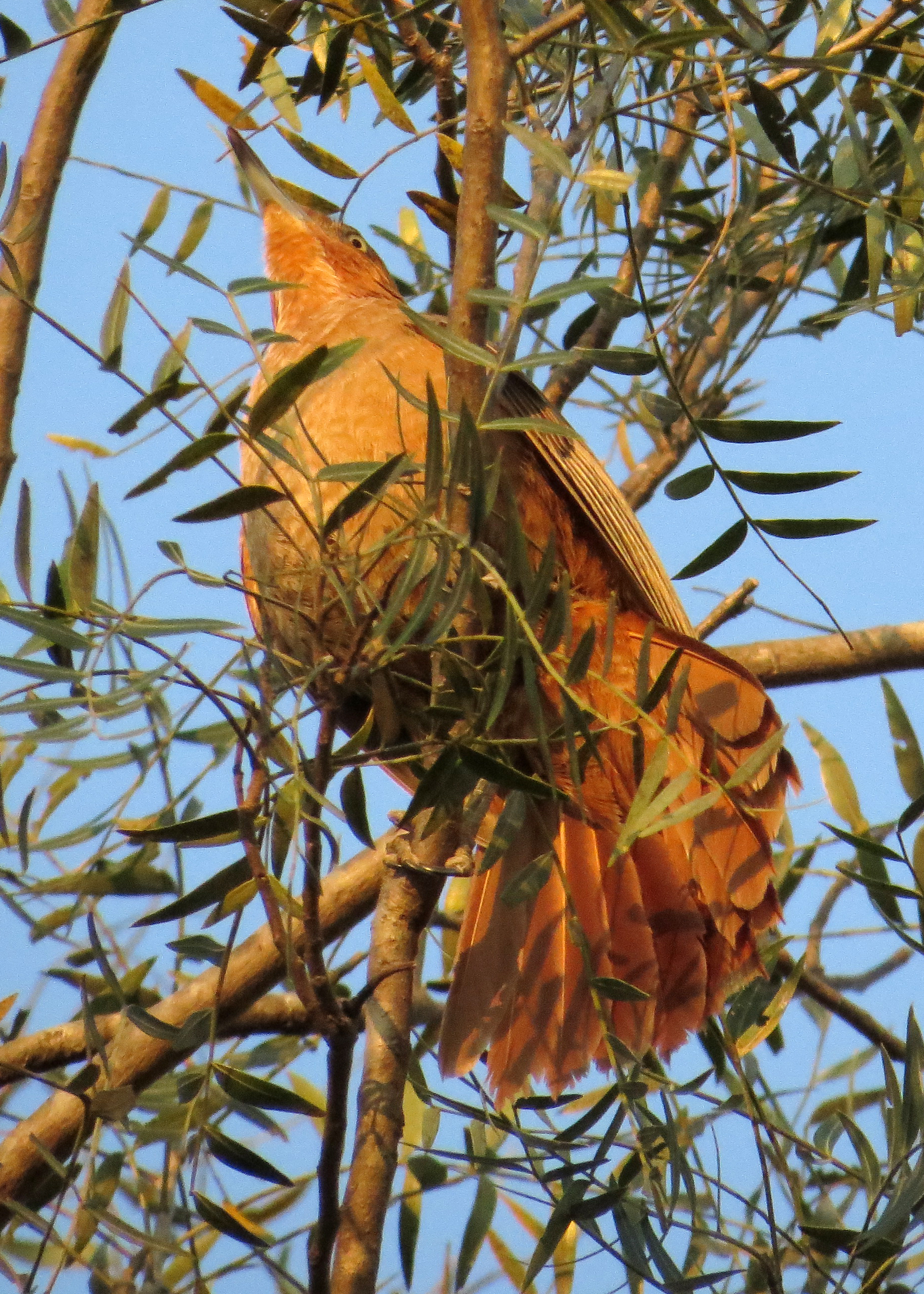 We did a lot of driving on the chaco’s dirt roads both by day and by night looking for mammals and nightbirds. We packed into the front vehicles, either inside or on the flat-bed, and then drove two-a-breast on the deserted roads. Once another car came the other way and flashed his lights at us, our driver responded by briefly putting on the mounted searchlight, which was followed by blue-and red flashing lights from the other car – yes, it was the police! Fortunately they passed us without issuing a ticket.