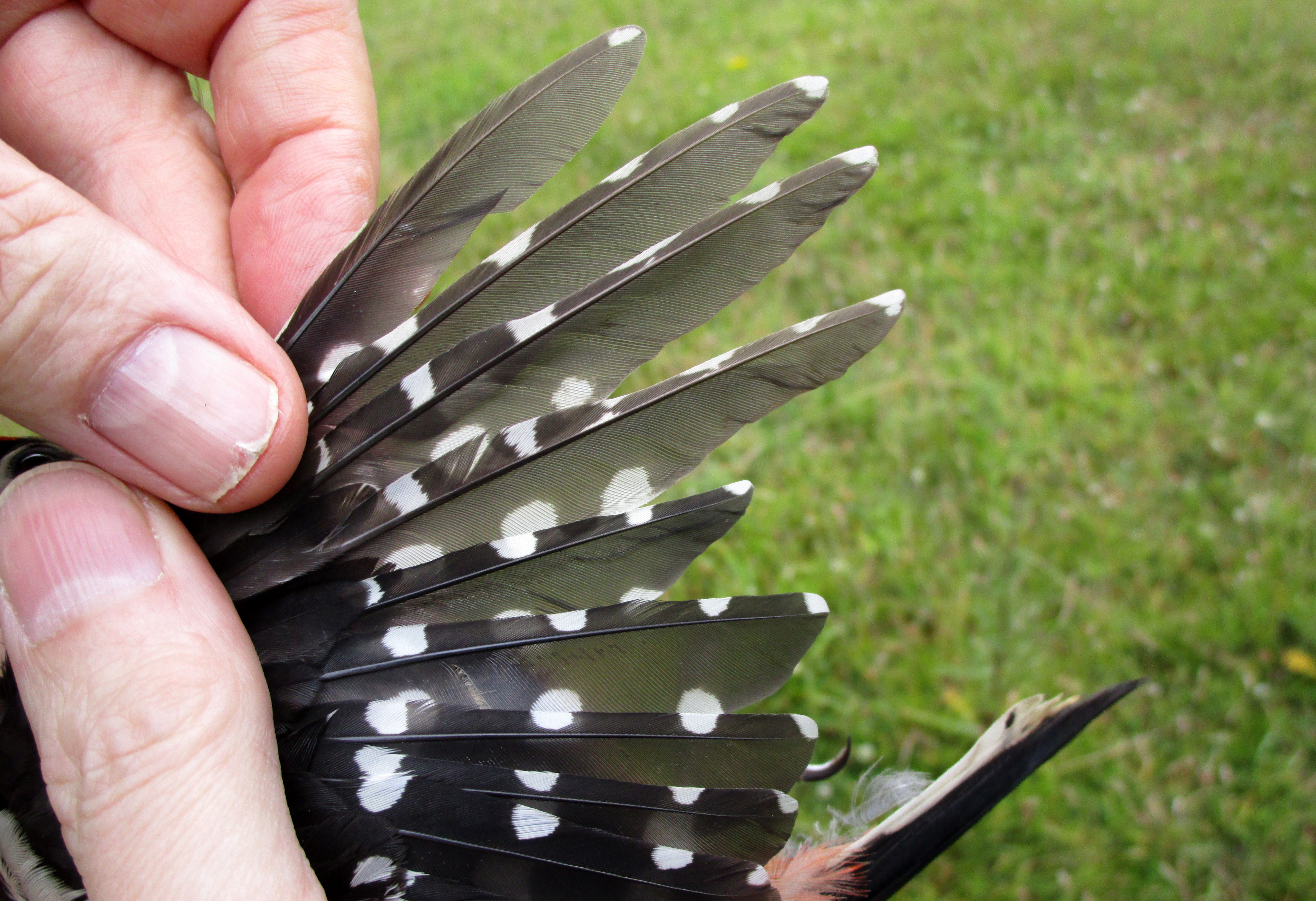 To show how complicated this moult business is, take a look at this juvenile Great Spotted Woodpecker (you will have to take my word that it has the red crown of a juvenile). Although it is only a few months old it is already undergoing a full moult with four outer primaries still to be replaced, the 5th growing and the rest completed. Strangely in its 1st year this species moults either none or some (but not all) of its primary coverts, so in the spring the primaries are fresh and the coverts are abraded.