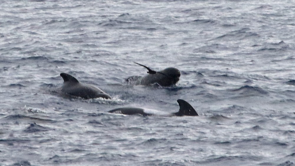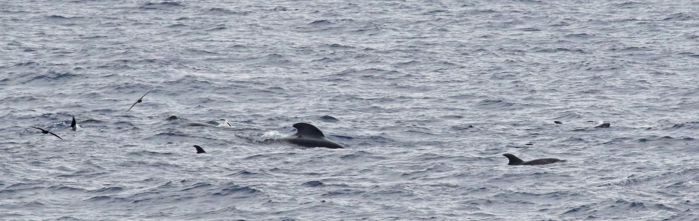 The characteristic dorsal fin of an adult Pilot whale can be seen, the other fin belong to dolphins. The birds are Black Petrels.