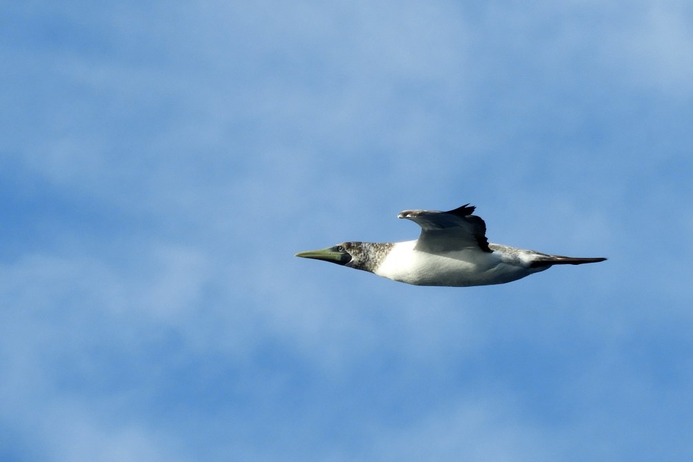 Australasian Gannet breeds, as the name suggests, in New Zealand and Australia and is very similar to our Northern Gannet except for having black in the secondaries and a long black gular stripe. We saw several hundred today, a single one the next day, then none.