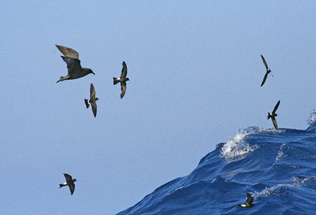 This photo wasn’t taken on the trip but from a small boat off the coast of North Carolina but it shows a number of birds we saw on the WPO. The large bird is an Arctic Skua (or Parasitic Jaeger) a bird that breeds in the arctic and subarctic (as far south as northern Scotland) and winters as far south as NZ. The two storm-petrels close to it are, as far as I can tell, Band-rumped. This complex probably consists of multiple species. We were only to see a few on the WPO and all were to the north of here and included one of a larger form that could be as yet undescribed. The lower left bird and the three on the right are Wilson’s Storm-petrels, the most numerous seabird and one of the most numerous of all birds in the world. Breeding in the Antarctic they are found in most oceans of the world at some time of the year. I saw a number off the Three Kings and others saw the odd one further north. Bizarrely it has been shown that the so called ‘northern storm-petrels’ are not closely related to ‘southern storm-petrels and they are found before and after the albatrosses in world bird lists. So the top two stormies on the left are not even in the same family as the top two on the right!