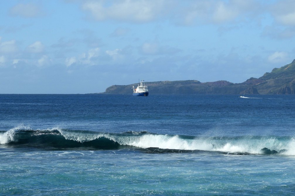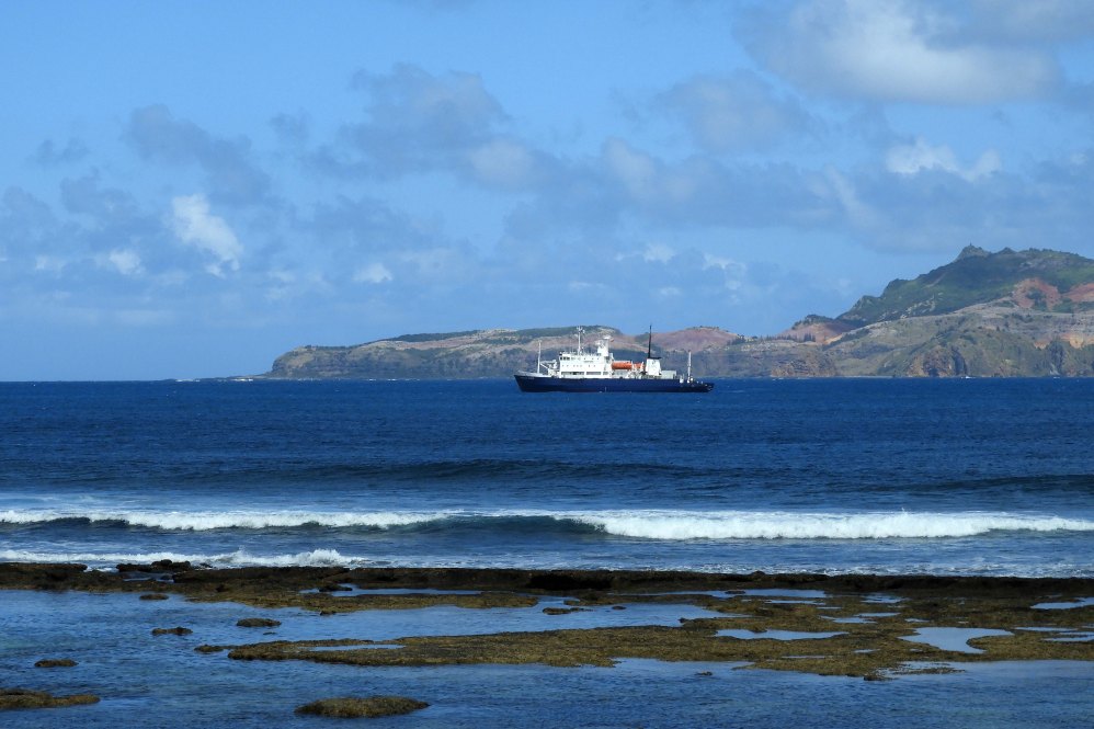 We travelled on the Professor Khromov, which the New Zealand company Heritage Expeditions likes to call ‘The Spirit of Enderby’. I’ve been on two other expeditions in this vessel; to the Subantarctic Islands of New Zealand in 2004 and to Russia’s Kuril and Commander Islands, Kamchatka and Sakhalin in 2017. I’ve also been to the Falklands, South Georgia and Antarctica on the sister ship Akademik  Shuleykin in 1998. There were nine ships of this class built in the 80s as Russian ‘research’ vessels (a euphemism for American submarine detection) and were ice strengthened and had the capacity to remain at sea without re-provisioning for extended periods of time. As soon as they were in service the Cold War was over and many were converted for ‘adventure tourism’ in high latitudes. They have given good service but are now looking rather dated. The electronics on the bridge and communication room looks 1940s vintage but they are tough and can withstand anything the polar seas can throw at them. The Professor Khromov is seen here moored off Norfolk Island.