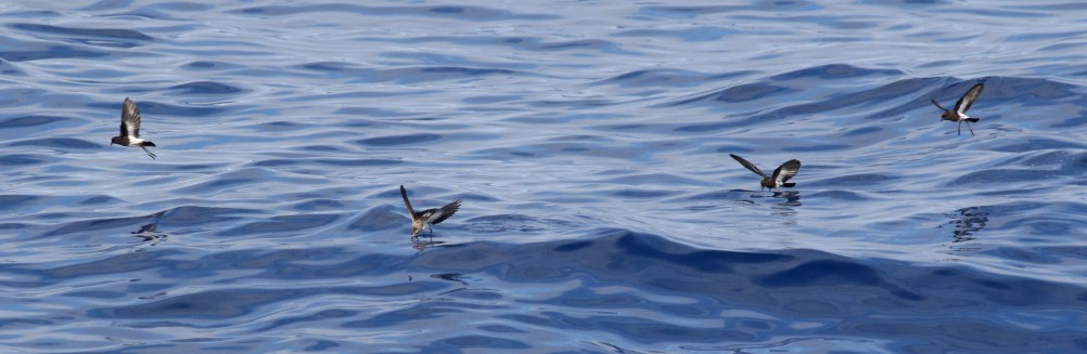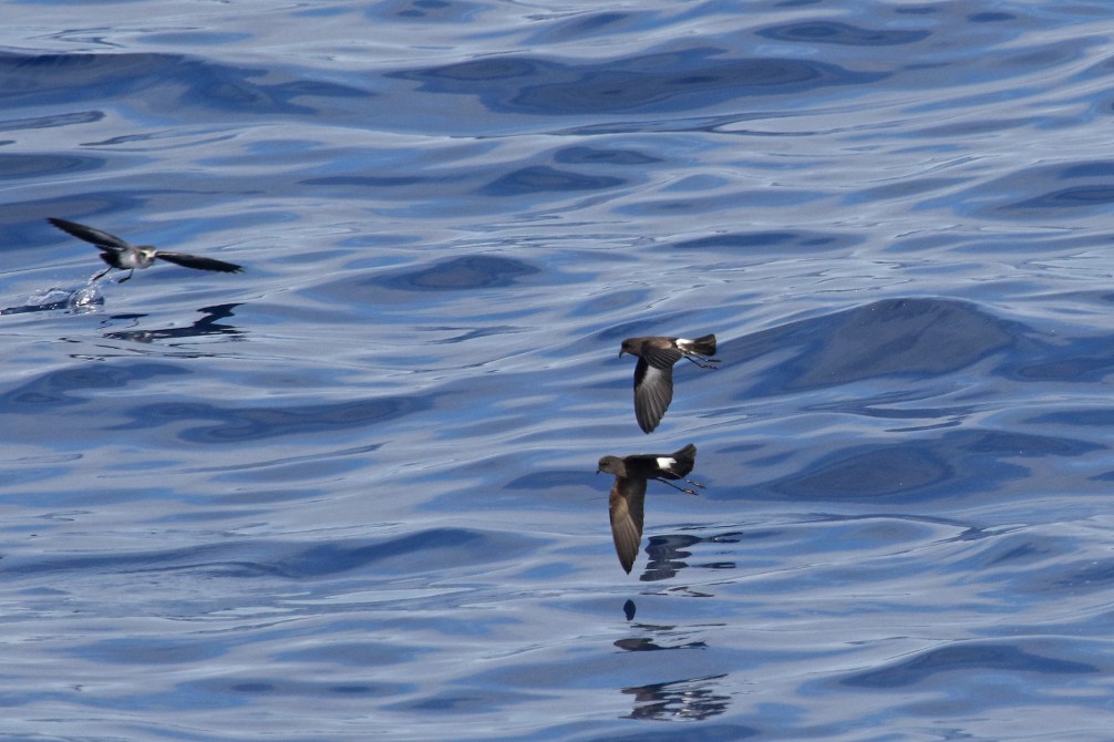 In this one photo there are three species of storm-petrel, White-faced on the left, Wilson’s lower centre and above it the enigmatic New Zealand Storm-petrel.