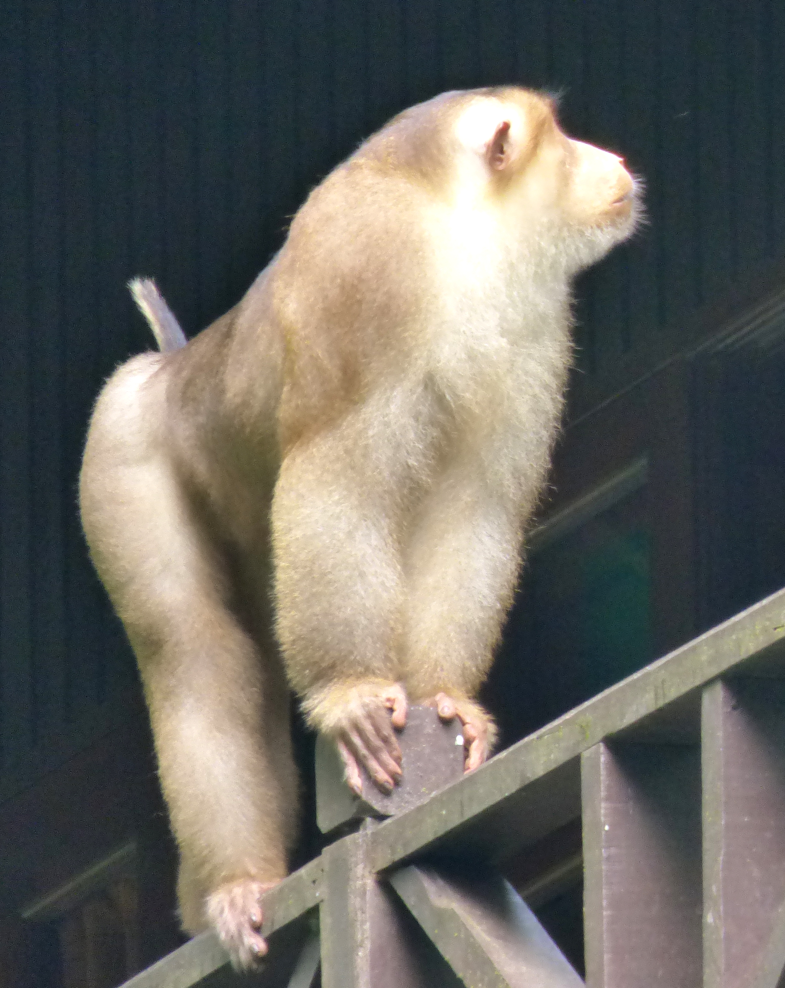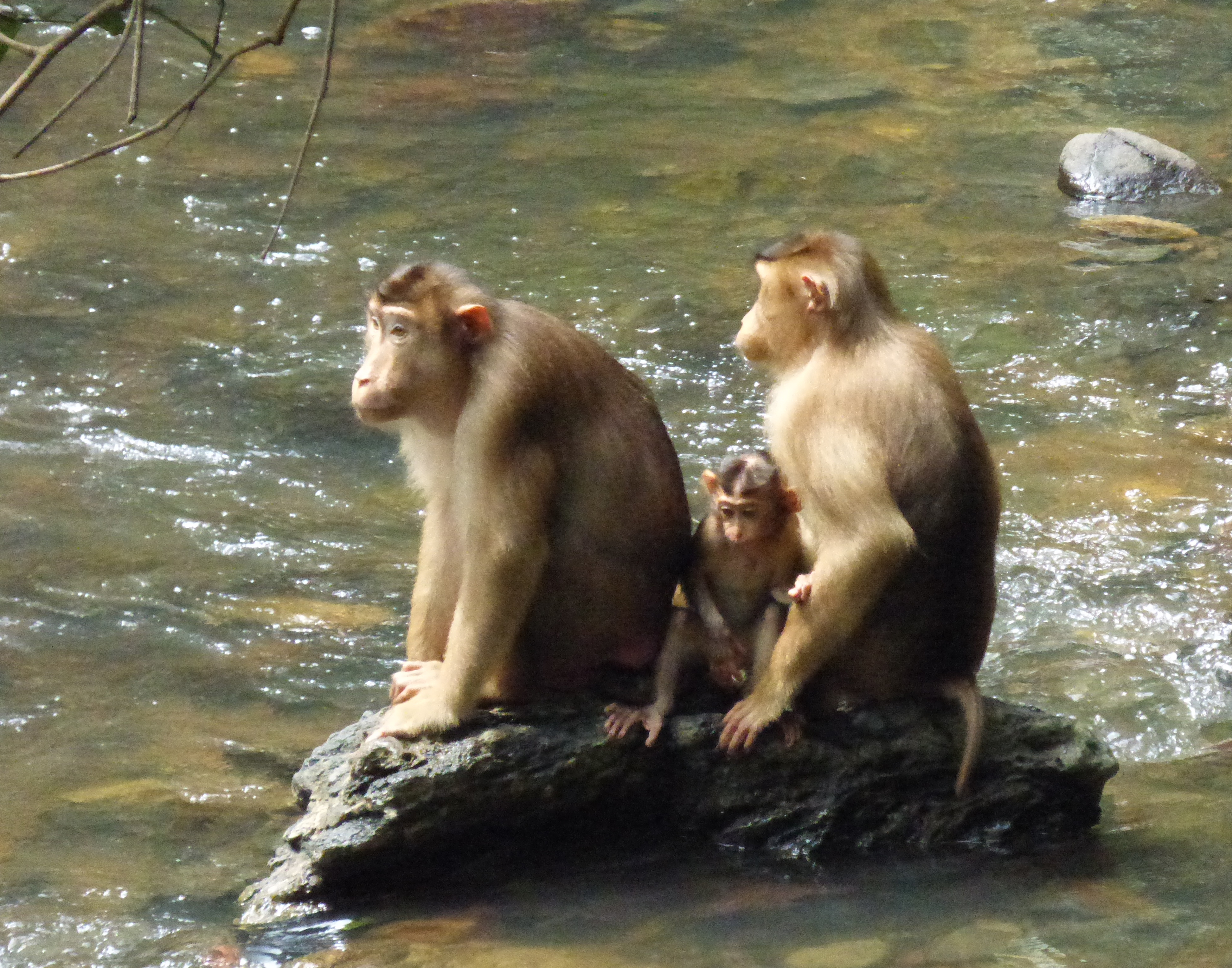 A large troop of Pig-tailed Macaques patrolled the area behind the chalets. The females often took to sitting on the rocks mid-stream, keeping their youngsters out of trouble.
