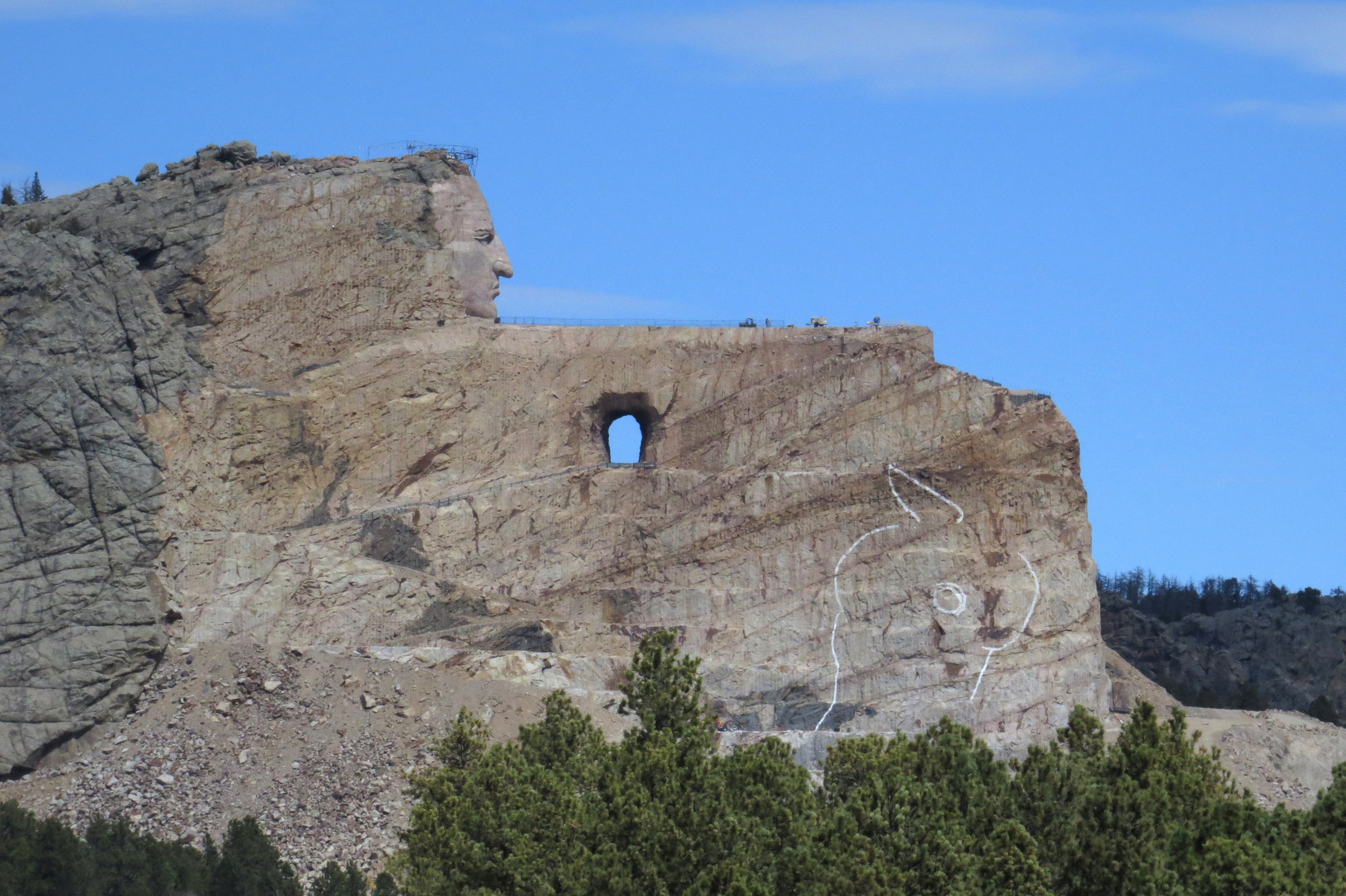 The Native American community have commissioned a huge stature of Crazy Horse which is being carved out of this rock outcrop ‘to show the white-man that the red-man has heroes too’. When complete Crazy Horse will be sitting astride his mount with his arm outstretched. I’m sure it will be magnificent, the entire statue will be nine times higher than the presidential heads at Mount Rushmore. The monument was commissioned in 1948 and as you can see only the head is complete. I doubt if it will be completed in our lifetime. The entry cost was quite high for a project that is still under construction, so we just took a photo from the main highway and moved on.