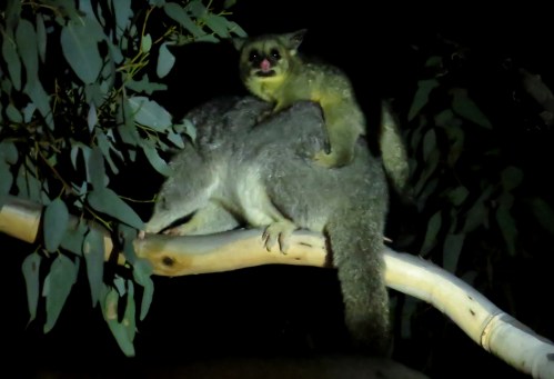 …. and after dinner we returned for a bit of spotlighting. It was quite windy and surprisingly cold, not the best conditions for night birds. and the only species seen was Tawny Frogmouth (which we had seen so well in daylight that morning). Of the mammals, we had hoped to see the rare Numbat but drew a blank, I had a brief view of a Southern Brown Bandicoot but the only mammal that stuck around was this Common Brushtail Possum with a baby clinging to its back.